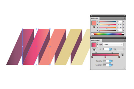 مستطیل های عمودی را انتخاب کنید و گرادیان آن ها را مشابه نزدیک ترین مستطیل اریب تنظیم کنید. برای تصحیح نوردهی، باید مستطیل های پشتی، کمی تیره تر باشند. برای این کار، به رنگ های گرادیان مستطیل های پشتی کمی سیاه اضافه کنید.